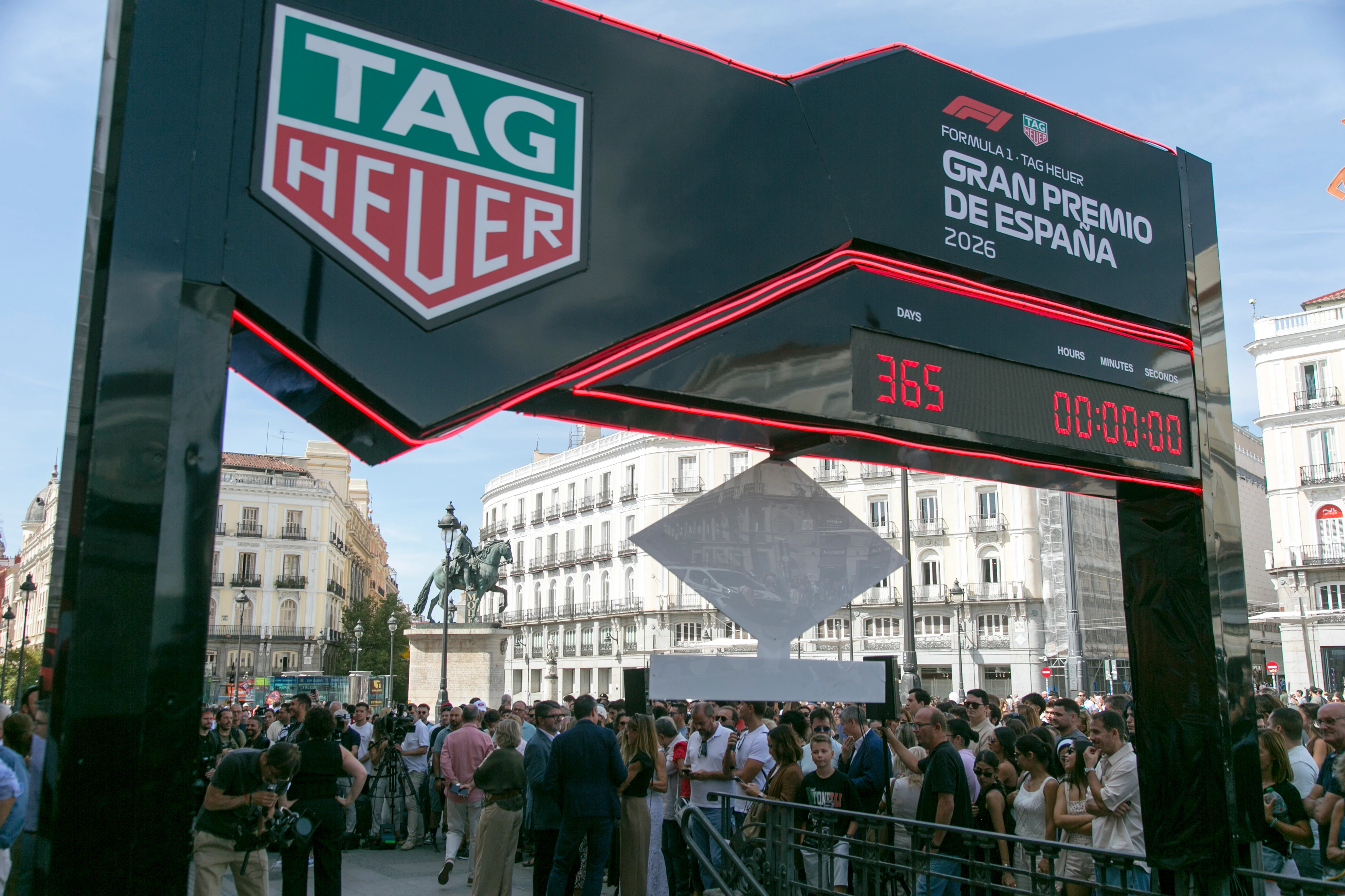 La marca suiza de relojería de lujo se convirtió en Cronometrador Oficial de la Fórmula 1 en 2025, gracias a un acuerdo global de diez años entre LVMH y la competición. El reloj de cuenta atrás permanecerá instalado en la Puerta del Sol durante los próximos 365 días, marcando segundo a segundo el tiempo que falta hasta las 15:00 horas del 13 de septiembre de 2026, cuando arranque el primer FORMULA 1 TAG HEUER GRAN PREMIO DE ESPAÑA.